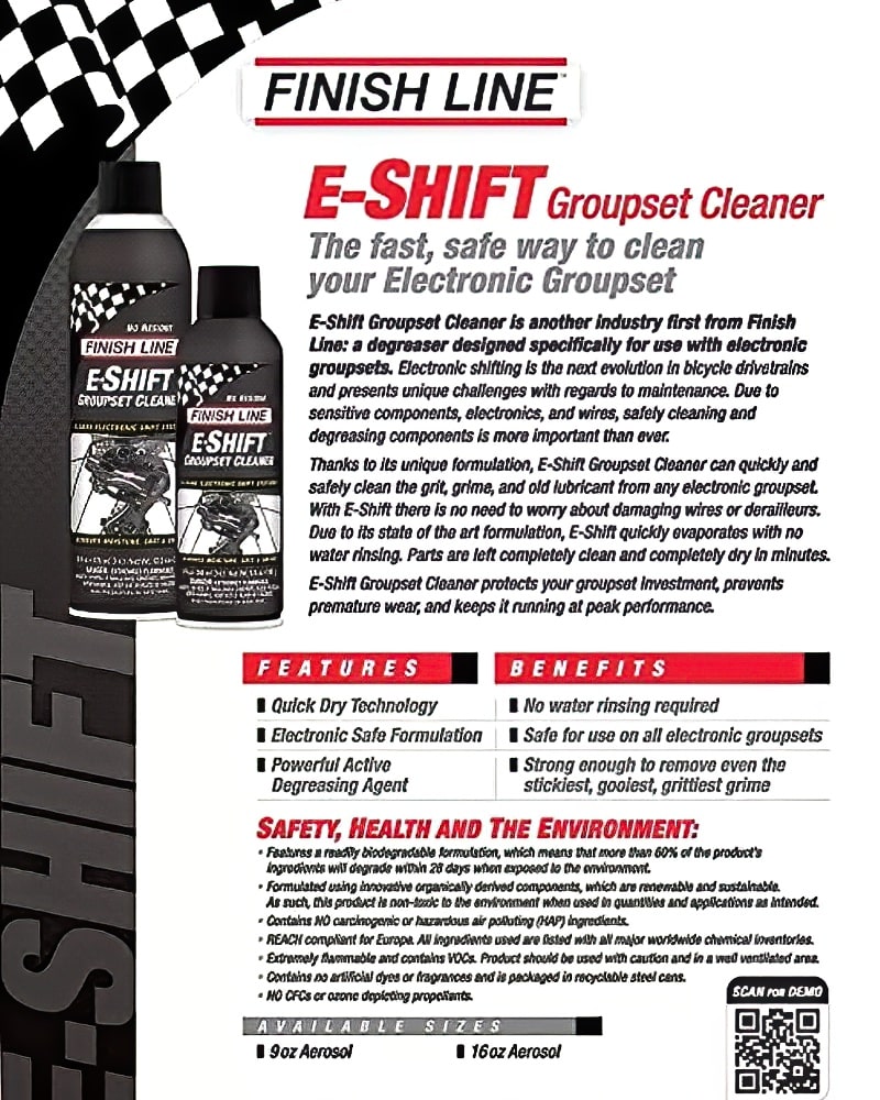 Thanks to its unique formulation, E-Shift™ Groupset Cleaner can quickly and safely remove grit, grime, and moisture from any electronic groupset. With E-Shift™ there is no need to worry about damaging wires or derailleurs. Due to its state of the art formulation, E-Shift™ quickly evaporates without leaving a residue behind, which means there is no need for water rinsing. Parts are left completely clean and dry in minutes.