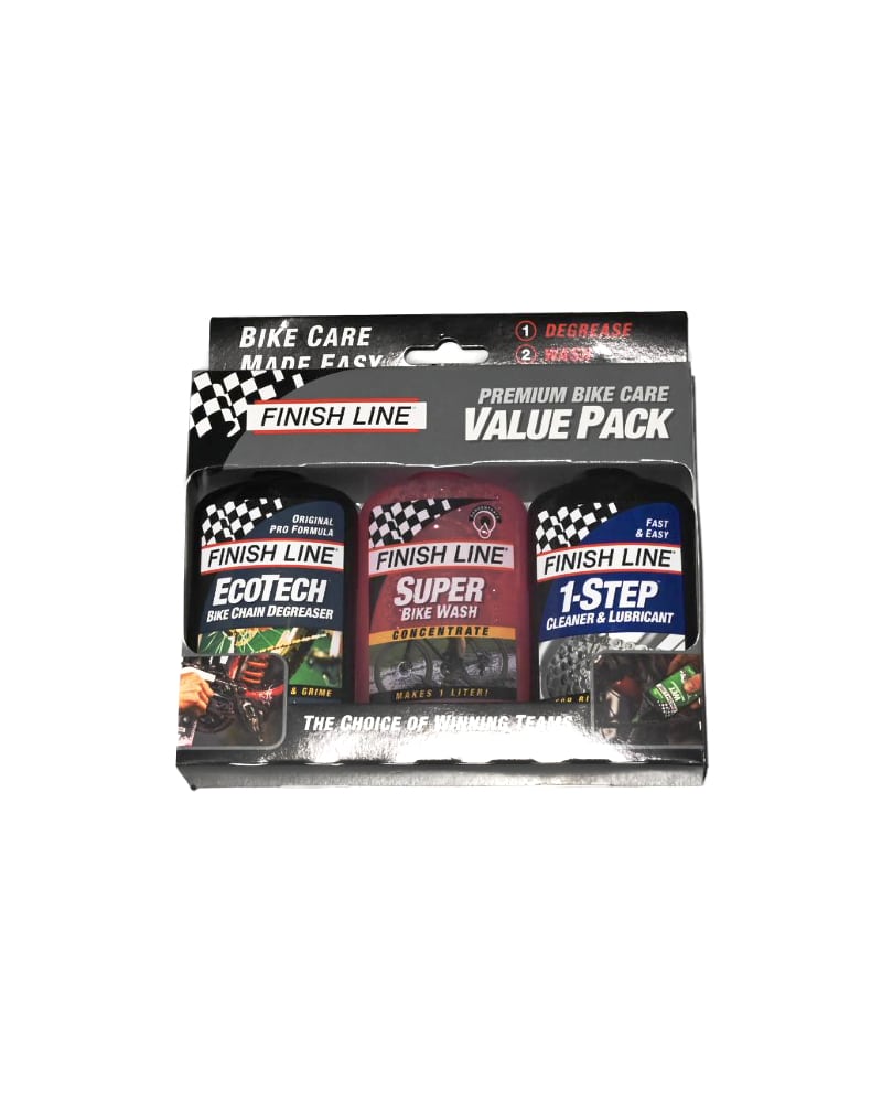 The Premium Bike Care Value pack is a variety of three unique Finish Line products. EcoTech Degreaser, Super Bike Wash™, Dry Lube, Wet Lube, Ceramic Wet Lube & Ceramic Wax Lube.