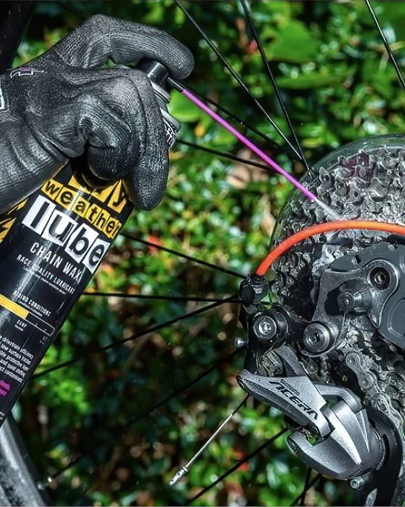-Spray a moderate amount of Muc-Off Wet Weather Lube to the inside chain link while spinning pedals in a reverse motion.