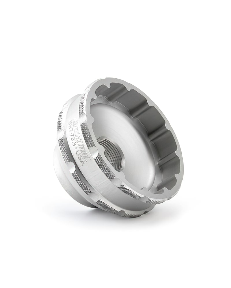 Precision CNC machined aluminium tool for the installation and removal of 16-notch external bearing bottom brackets. Featuring updated tooth profiles to optimize the fit between the tool and high-performance BB parts. Anodized and laser engraved for easy identification and featuring a ratchet/torque wrench compatible 3/8″ drive.