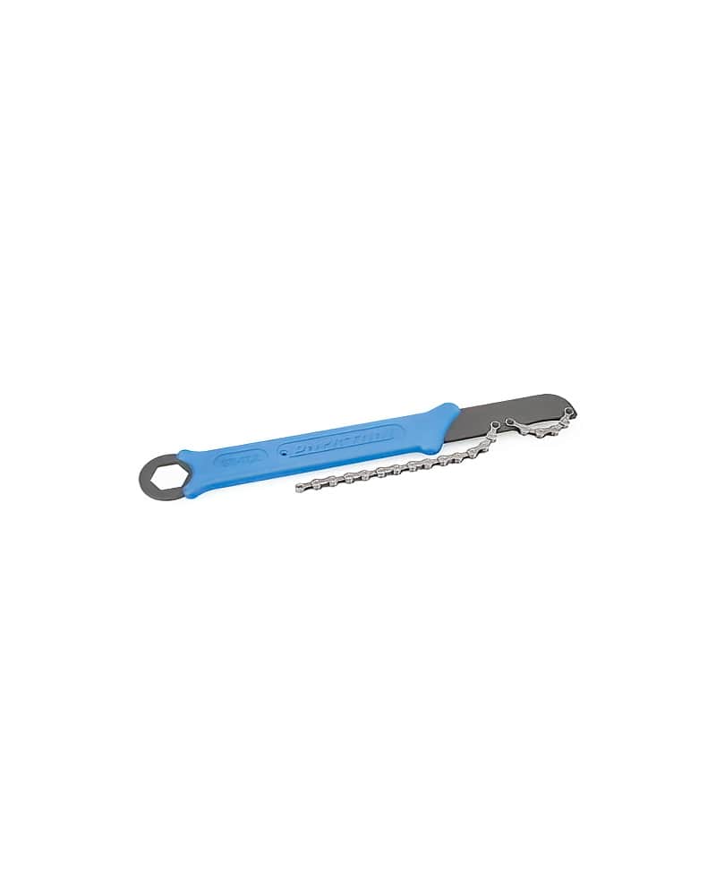 Updated to fit current 12-speed cassettes, this combination chain whip and freewheel / lockring remover wrench is heat treated to prevent bending, flexing and wear and features a long, molded handle in addition to a built in hex shaped driver.