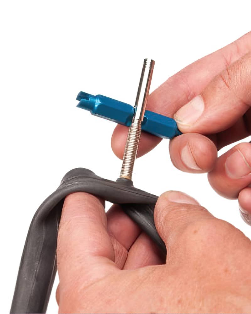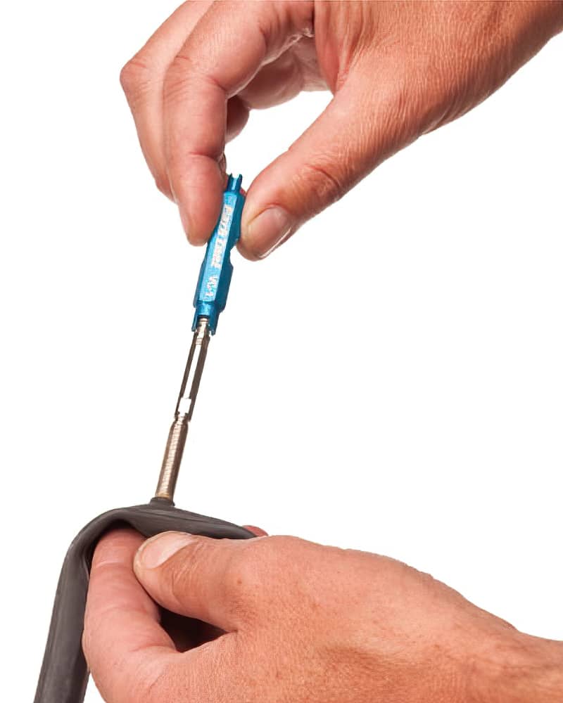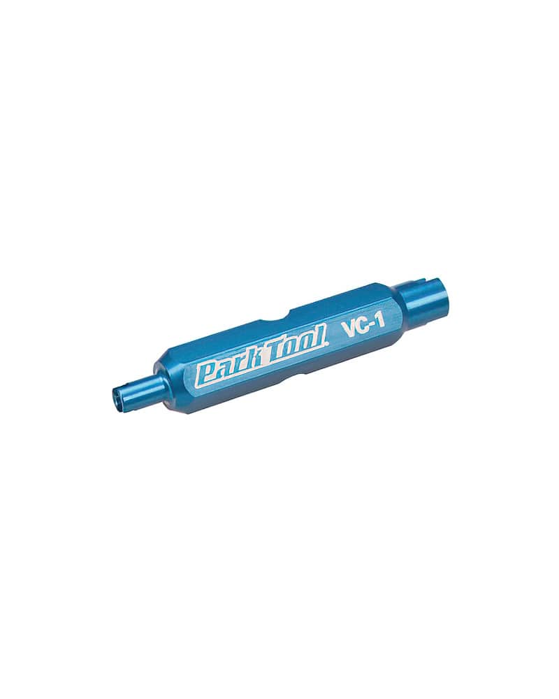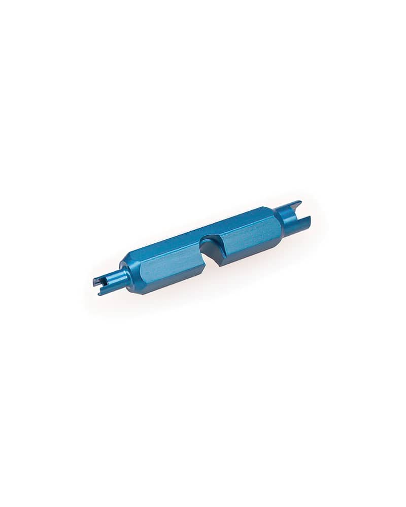 A small, handy tool designed to remove and install Schrader and Presta valve cores and to remove and install Presta valve extenders with 5mm wrench flats.