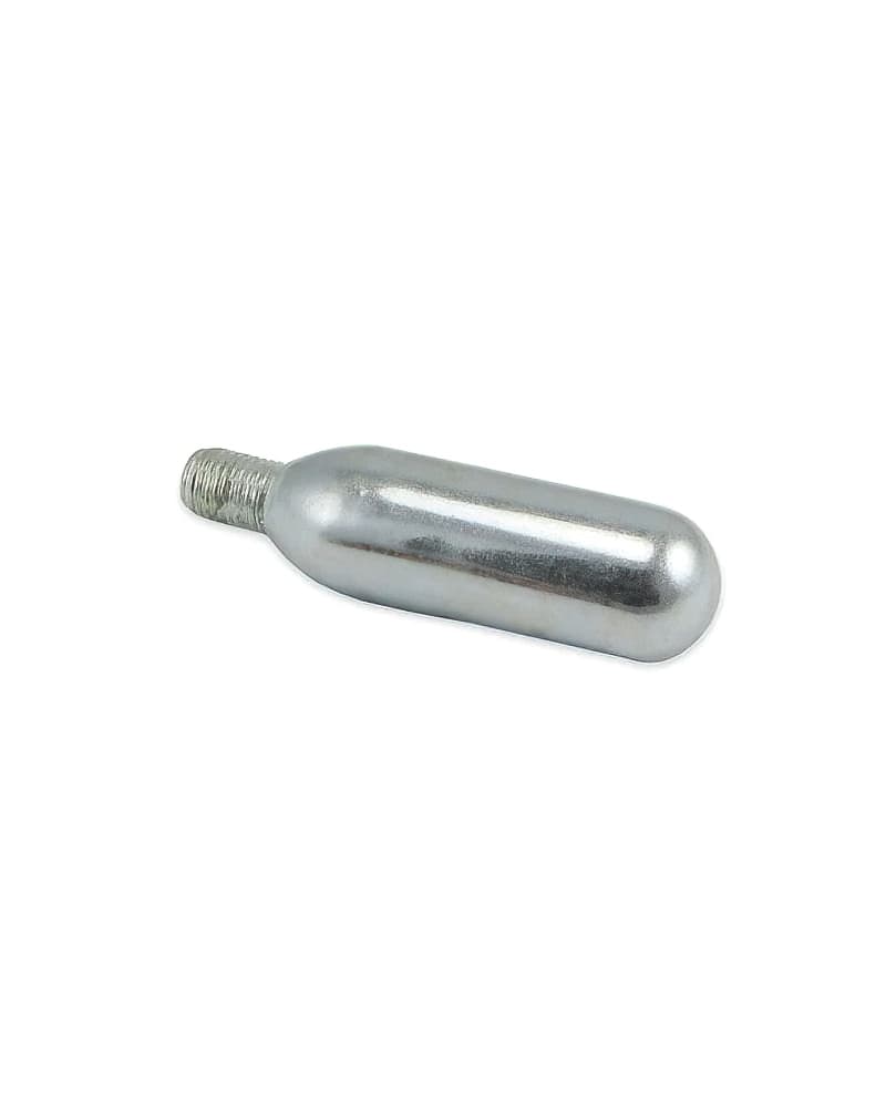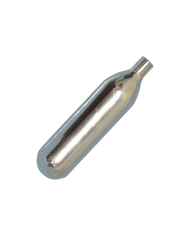 A Threaded CO2 cartridge for use with CO2 inflators. It inflates 700c road tire to 120psi (8.3bar) or one 26” MTB tire to 30psi (2.1bar) for 16g Co2.
