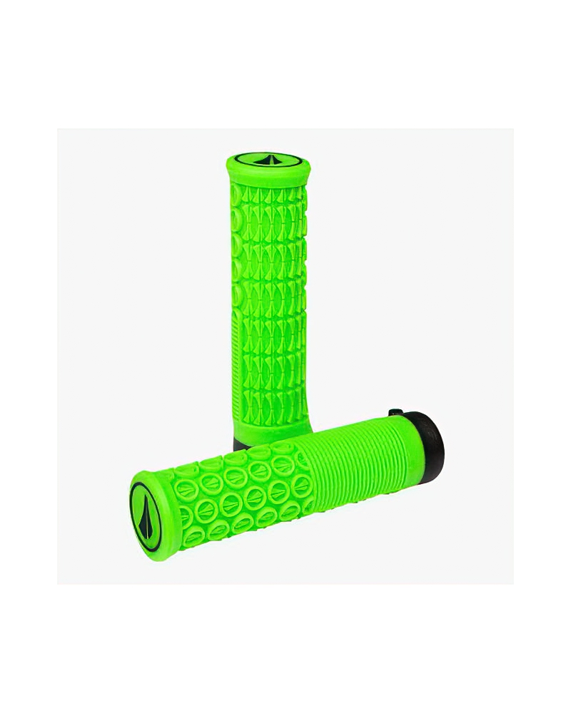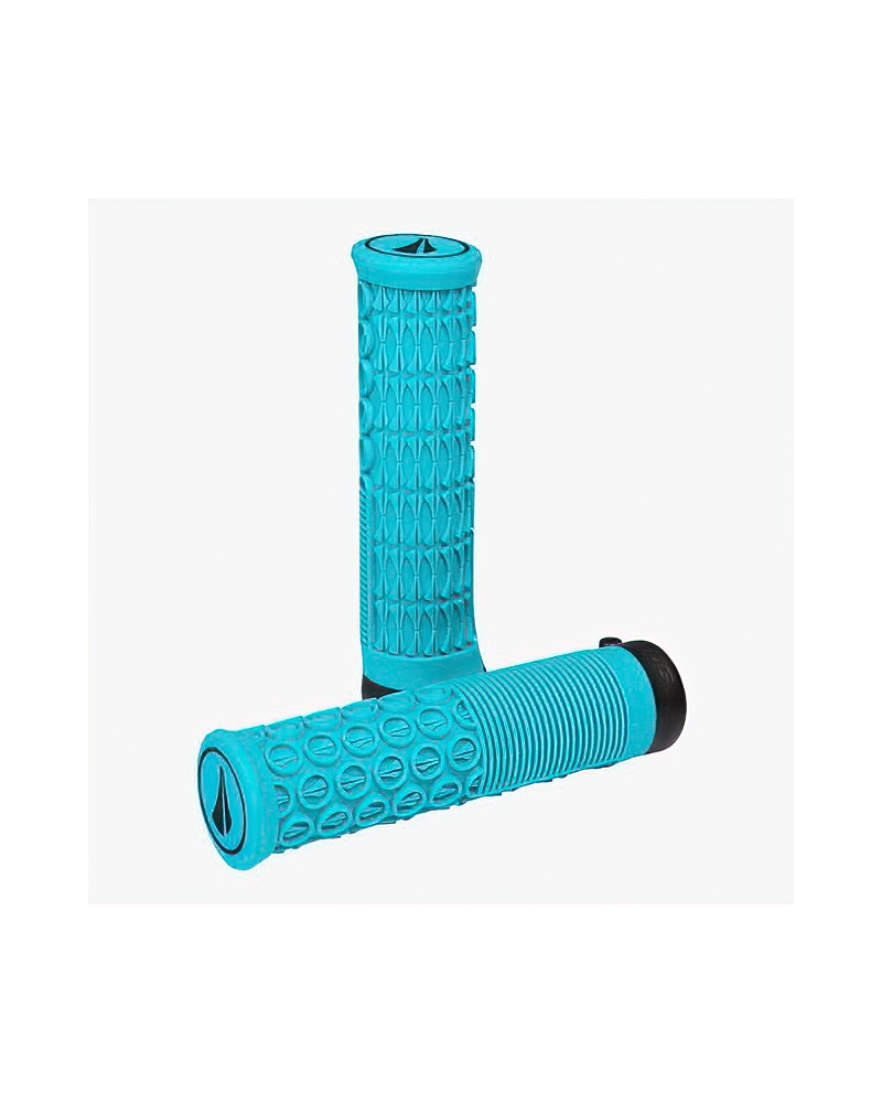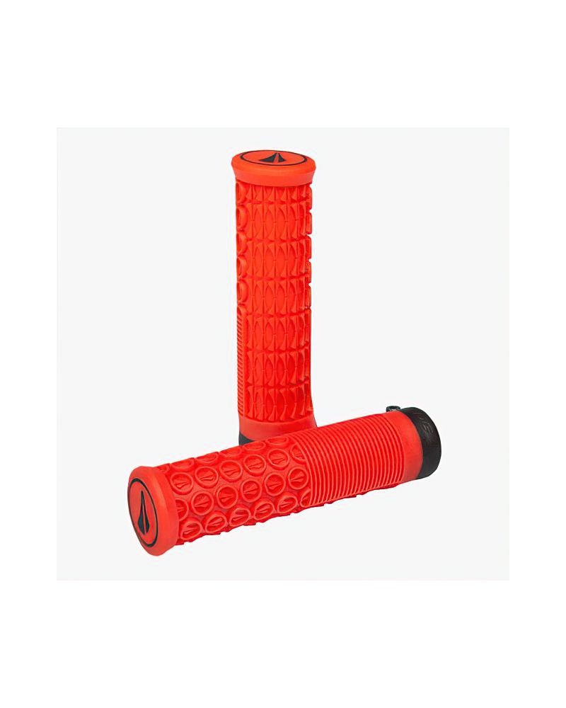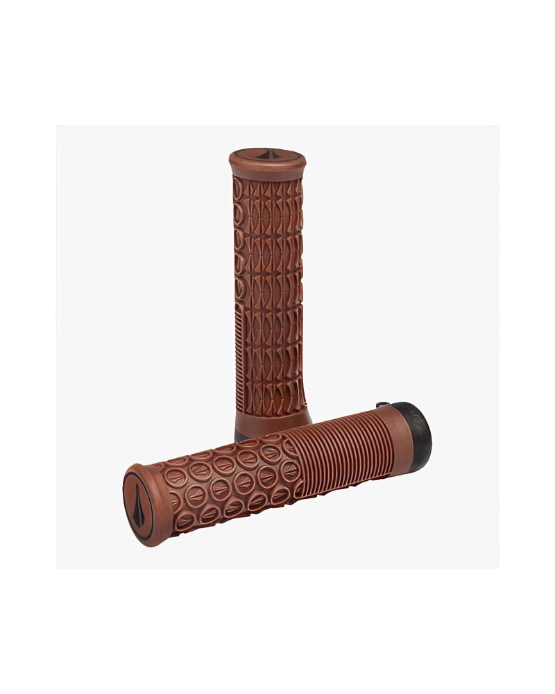 Dual Density Design. – – Integrated, 1pc Lock-On. – – Tapered Inner Core – prevents slippage. – – Mushrooms for ultimate comfort. – – Ergonomically ramped and undercut grabbers for superior grip. – – Ovalized design for ultimate comfort and control – – Circular Iconic dampers – – Flared outer ends – –
