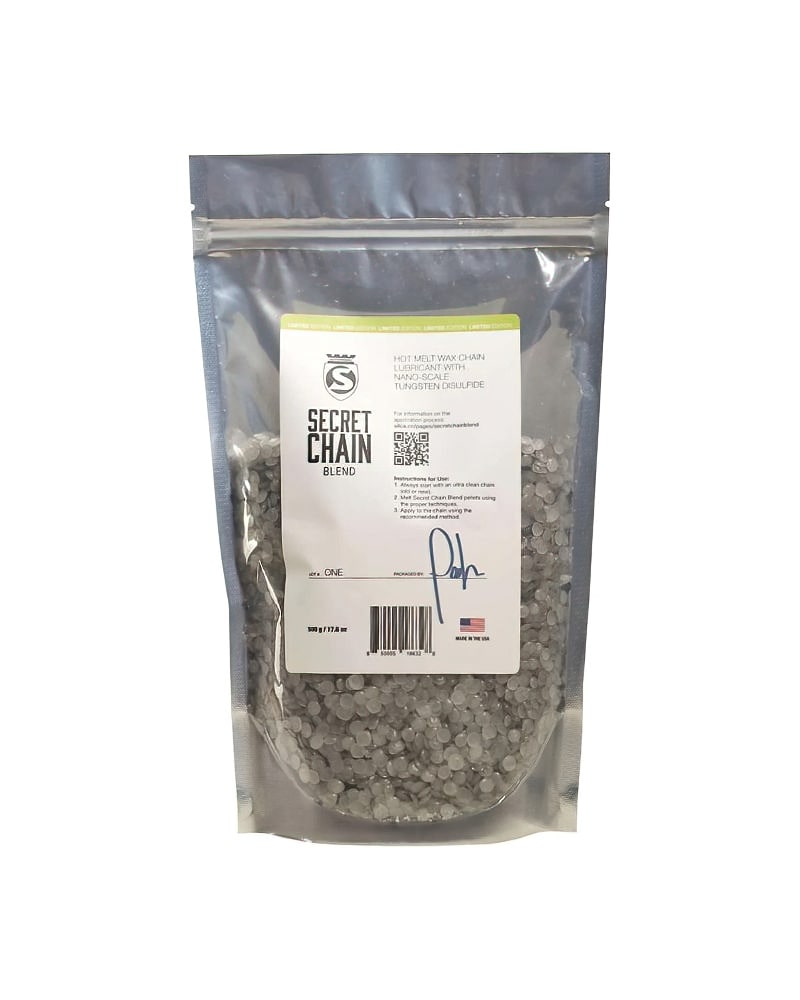 Consisting of highly refined laboratory-grade paraffin and a high concentration of 3 specific sizes of nano-scale Tungsten disulfide, Secret Chain Blend not only acts as a lubricant but actually acts to modify the surface of the chain, filling in all of the crevices of the metal with highly lubricious and wear-resistant tungsten disulfide particles. As a result, chains waxed with Secret Chain Blend and Secret Chain Lube will actually get faster over time and after repeated waxings. Secret Chain Blend is the only hot wax lubricant to have a specifically matched and compatible drip wax which can be used to ‘top off’ the wax as needed, extending the duration between hot wax applications, and guaranteeing the quietest running drivetrain possible. Using the combination of Secret Chain Blend and Secret Chain Lube can dramatically extend the chain and drivetrain component life (up to 10x).