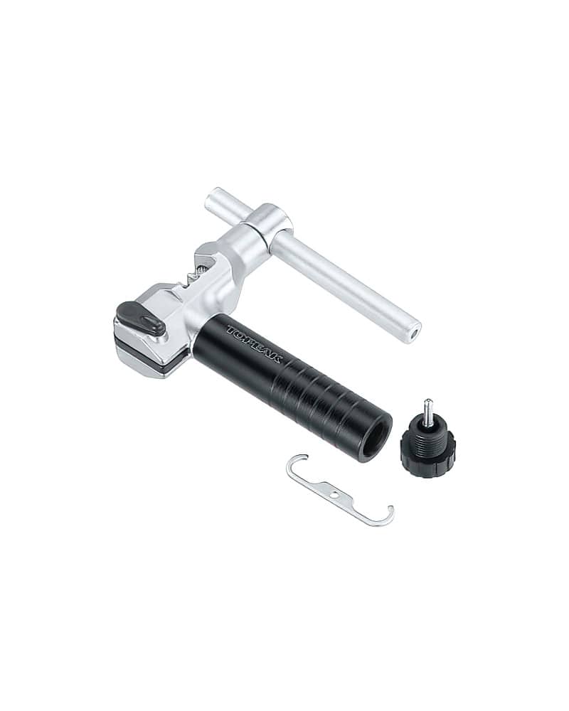 High quality chain tool with replaceable plunger pin for single and multi-speed chains up to 12 speed, including Campagnolo® 12 speed hollow pin chains. Included chain hook holds links during assembly. Storage space for the included chain hook and one spare plunger pin.