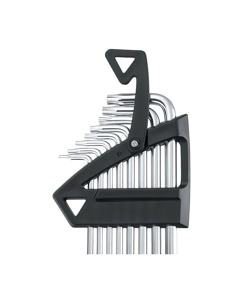 8 pro quality, SNCM-V steel Torx® wrenches. Includes a foldable hanger for hanging the wrench set on wall for storage.